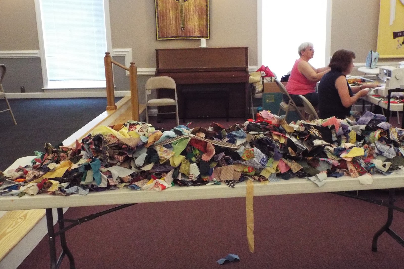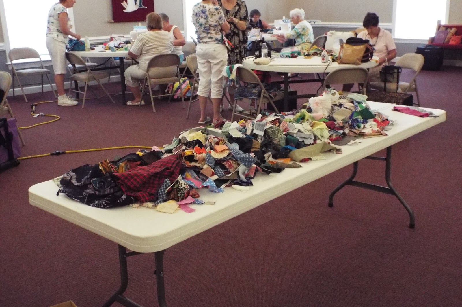 Yesterday was our community outreach workshop at the guild. We worked on the firehouse quilts. Brunswick County has now required the main firehouse in each district to be manned 24 hours. That means there will be three people sleeping there at night. We decided to make quilts for those beds. So we have been busy strip piecing blocks to get these done. This is what we started with. Well actually I didn’t get the picture taken before the girls started going through the strips.