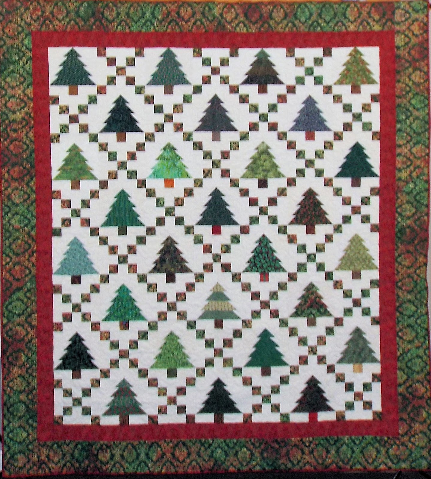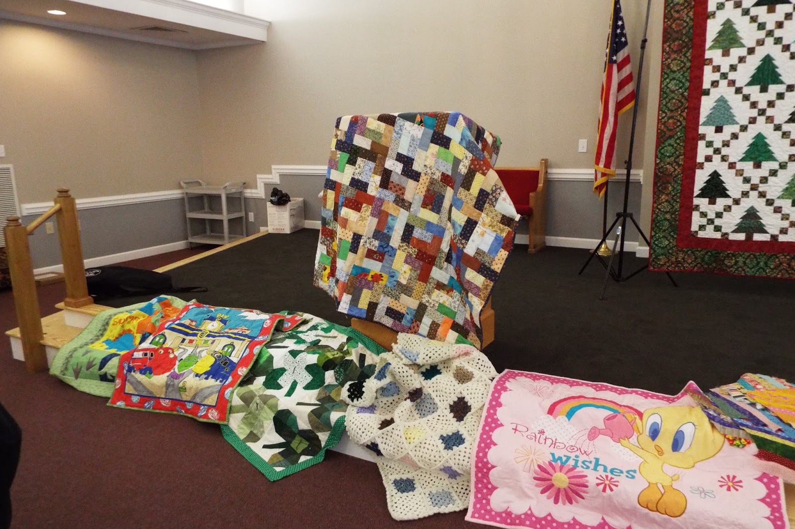 We are so blessed to be able to meet at the Presbyterian Church in town. The room is big and bright. We have access to a full kitchen that we use several times a year for celebrations. And the best part is we have the nicest members you could ever find. 🙂 I just finally got a good picture of our 2015 Raffle Quilt. It was made by all of our members. Isn’t it beautiful? I love Christmas quilts. Maybe I’ll win it, well I can hope.