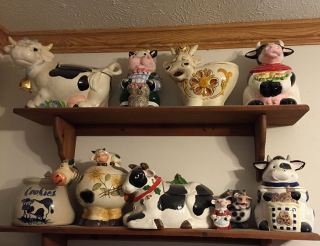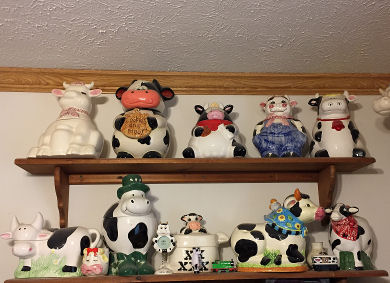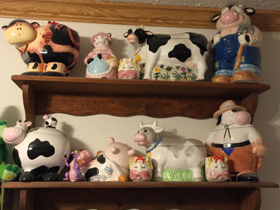 We have live cows that live on the small farm across the field behind us. I love to hear them moo, especially at night while I am lying in bed. We used to have a farmer across the highway from us who had quite a few cows, but he moved away and took his cows with him. 😦 But that’s OK, I have my own herd all over my house. I have 25 cow cooking jars here in my office alone. They make me smile. No matter what my mood, it always improves when I look at my cows. Take a look. See what I mean?